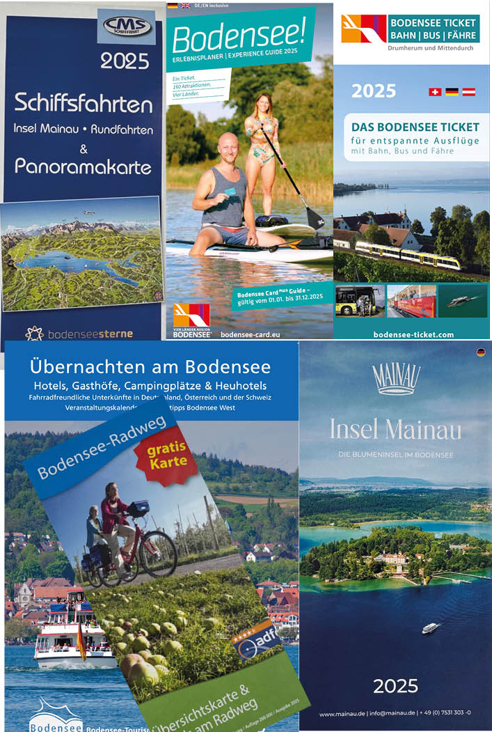 Das Erlebnispaket beinhaltet die Prospekte des BodenseeTicket, der Insel Mainau, der Bodensee Card plus, die Bodensee-Radwegkarte, den CMS Schiffsplan und das Übernachten am Bodensee Verzeichnis.